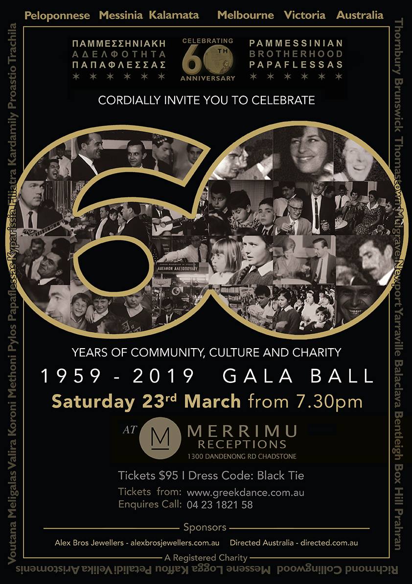 The Messinian community in Melbourne celebrating "23rd March 1821", the Independence Day of Kalamata and the start of a free Modern Greece, at the Malvern Town Hall, Victoria, in 1961. Hosted by the PamMessinian Brotherhood "Papaflessas", founder of the Pan Messinian Federation of Australia and New Zealand.