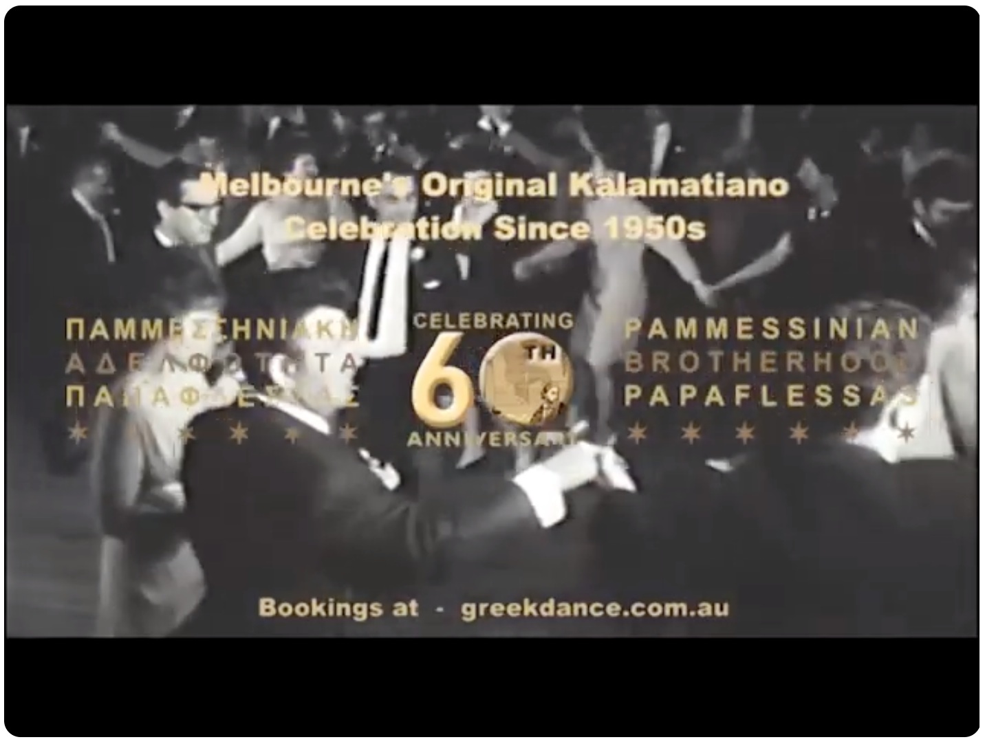 From rural areas around the City of Kalamata, many young people migrated to Canada, Germany and Australia. Down under they settled mainly in the Cities of Adelaide, Sydney and Melbourne. In the late 50s members of the Messinian communities established organisation to support each other. In South Australia there are the Messinian Association of S.A, while in Victoria the PamMessinian Brotherhood "Papaflessas" was launched in 1959. This digitised 8mm film footage shows some of the people who attended Papaflessas' inaugural '23rd March' Ball at Earl's Court in St Kilda, in 1959